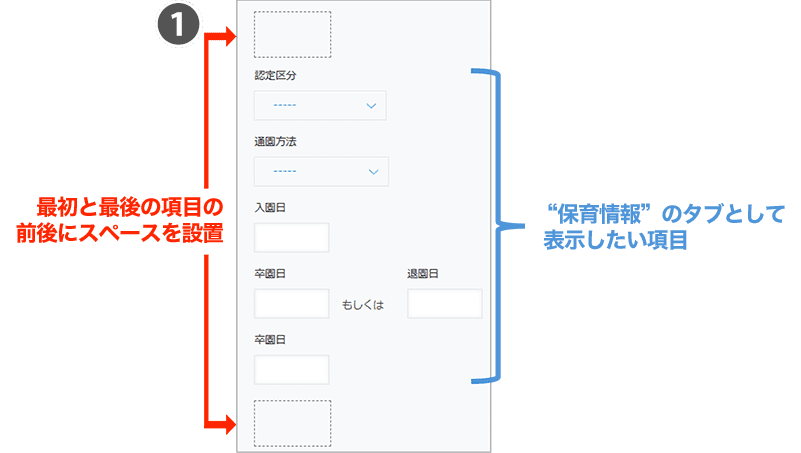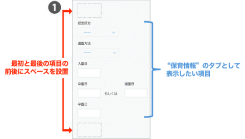 どの項目からどの項目まで、1つのタブとして表示させるかの指定を【スペースフィールド】の ”要素ID” を使って行います。