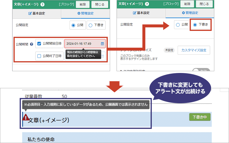 【ブロック・データ】公開期間設定のアラートが下書きの場合も表示される