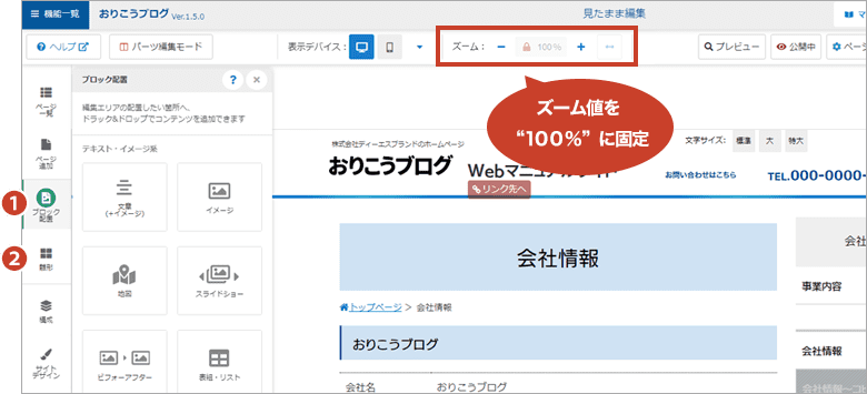 ブロック配置・雛形機能を使用時、ズーム値が100%になるように調整