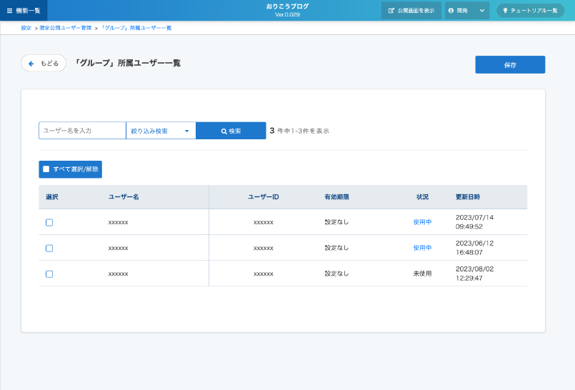 追加したいユーザーの"選択"にチェックし、画面右上の【保存】ボタンをクリックすると、グループに登録されます。