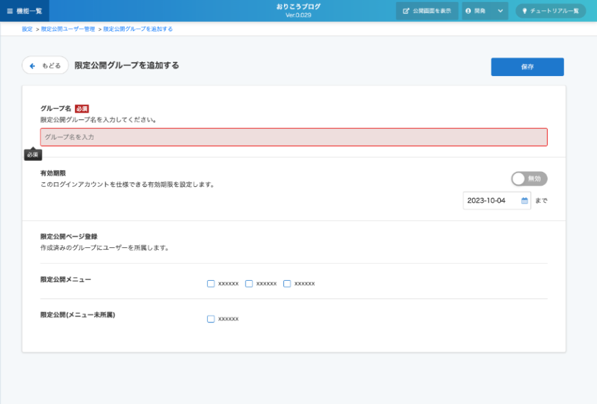 新たに限定公開グループを追加したい場合、"グループ一覧画面"で【新規登録】ボタンをクリックし、"限定公開グループ新規追加"画面を表示します。