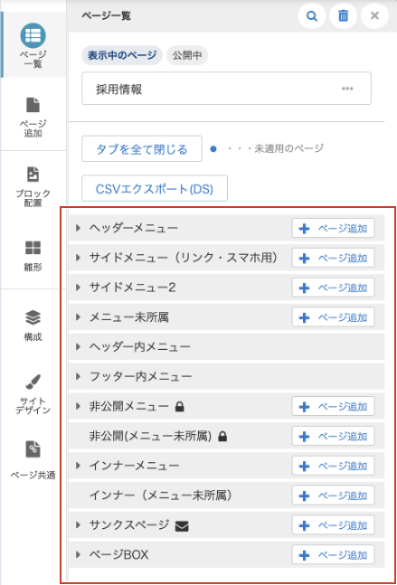 "すべて"を選択するとページ内に登録している階層がすべて表示されます。