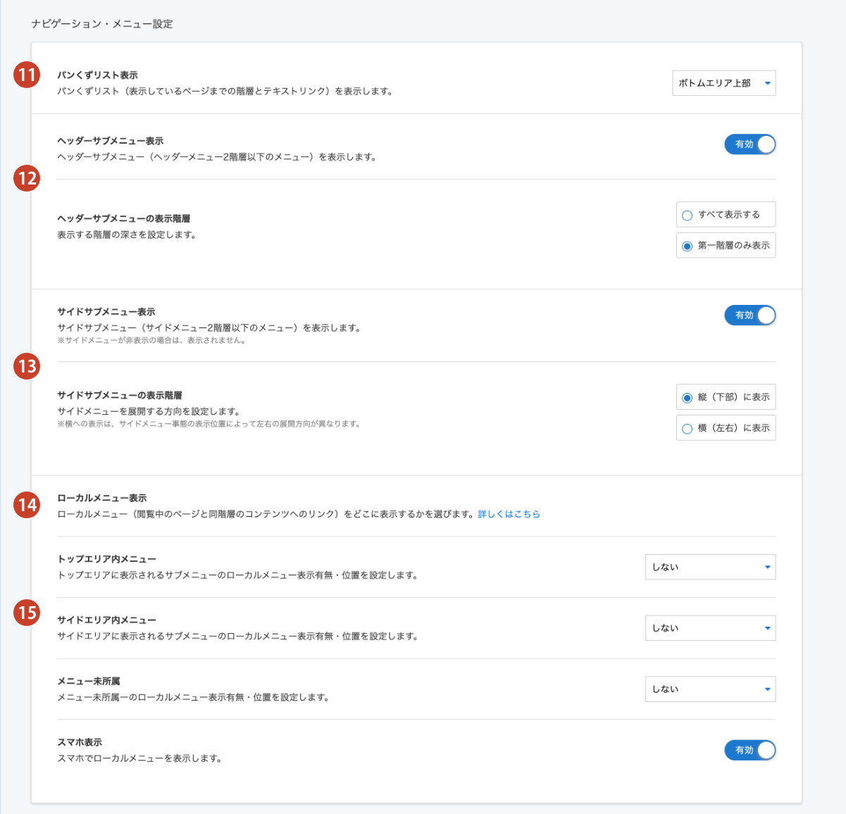 サイドエリアに表示されるサブメニューのローカルメニュ―を表示エリアを、"しない"、"コンテンツエリア内上部"、"サイドメニュー内"、"ローカルメニューパーツ内"から選択できます。