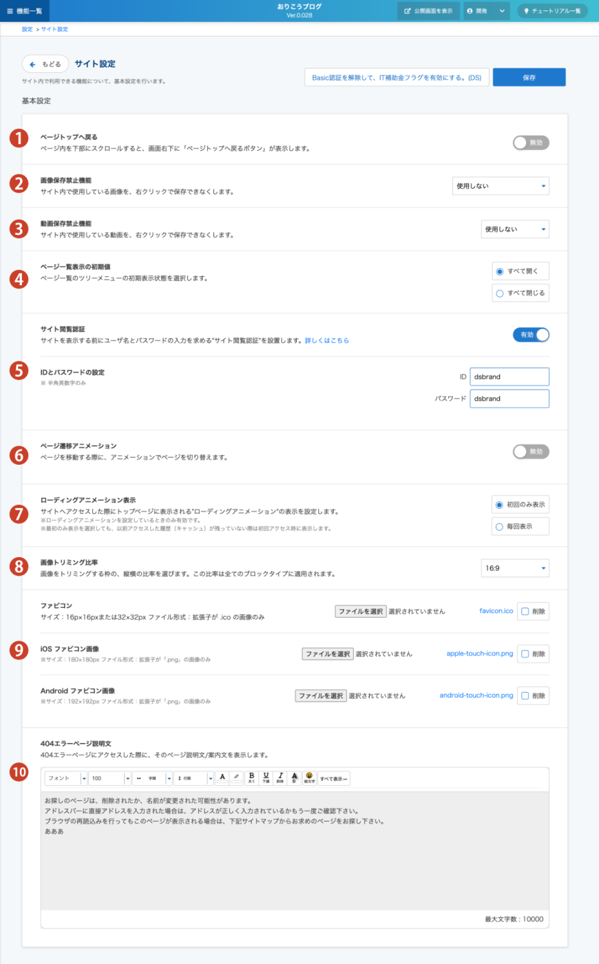 メニューから”設定>サイト設定”をクリックすると、”サイト設定”画面が表示されます。”サイト設定”画面では、サイト全体に共通する機能や基本的な情報を設定します。