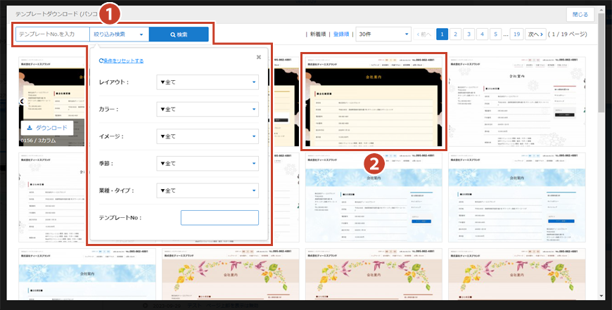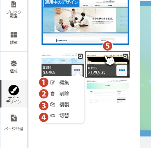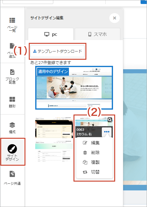 デザイン編集では、デザインテンプレートのダウンロード、レイアウトの変更など、サイト全体で共通のデザインを管理します。